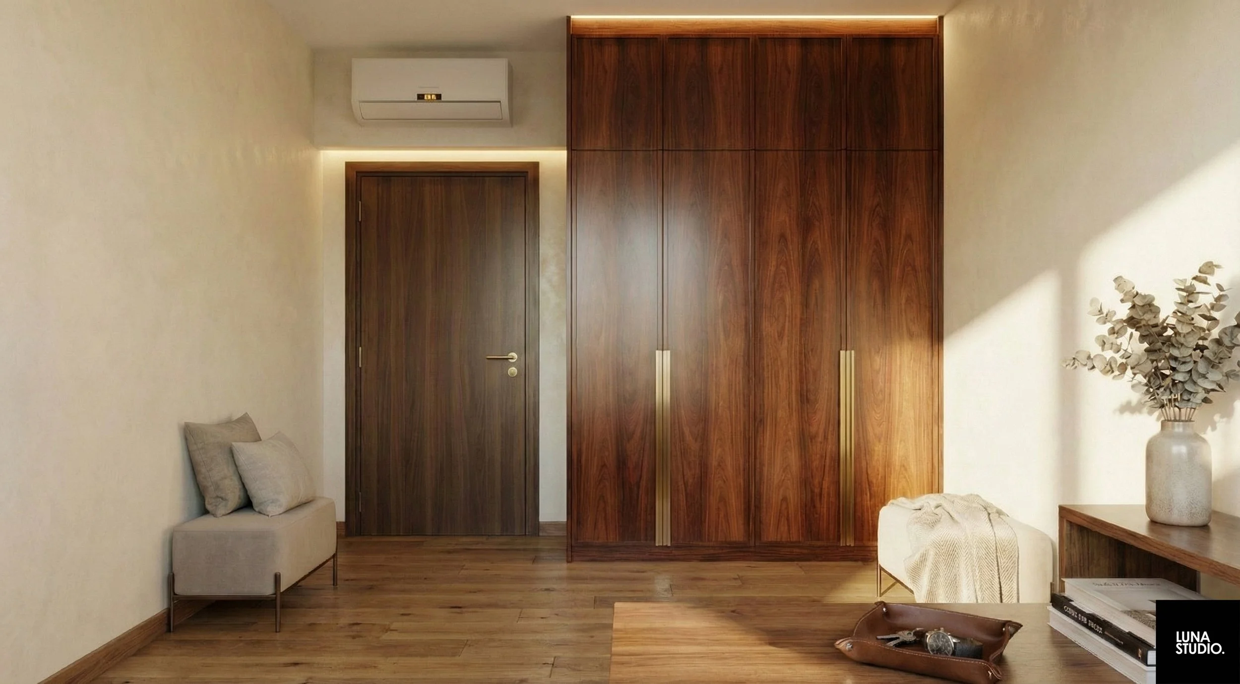 Wrapped in the deep embrace of rich walnut and bathed in the golden whisper of filtered sunlight, this space breathes a quiet promise of serenity where the chaos of the world simply fades into the shadows.