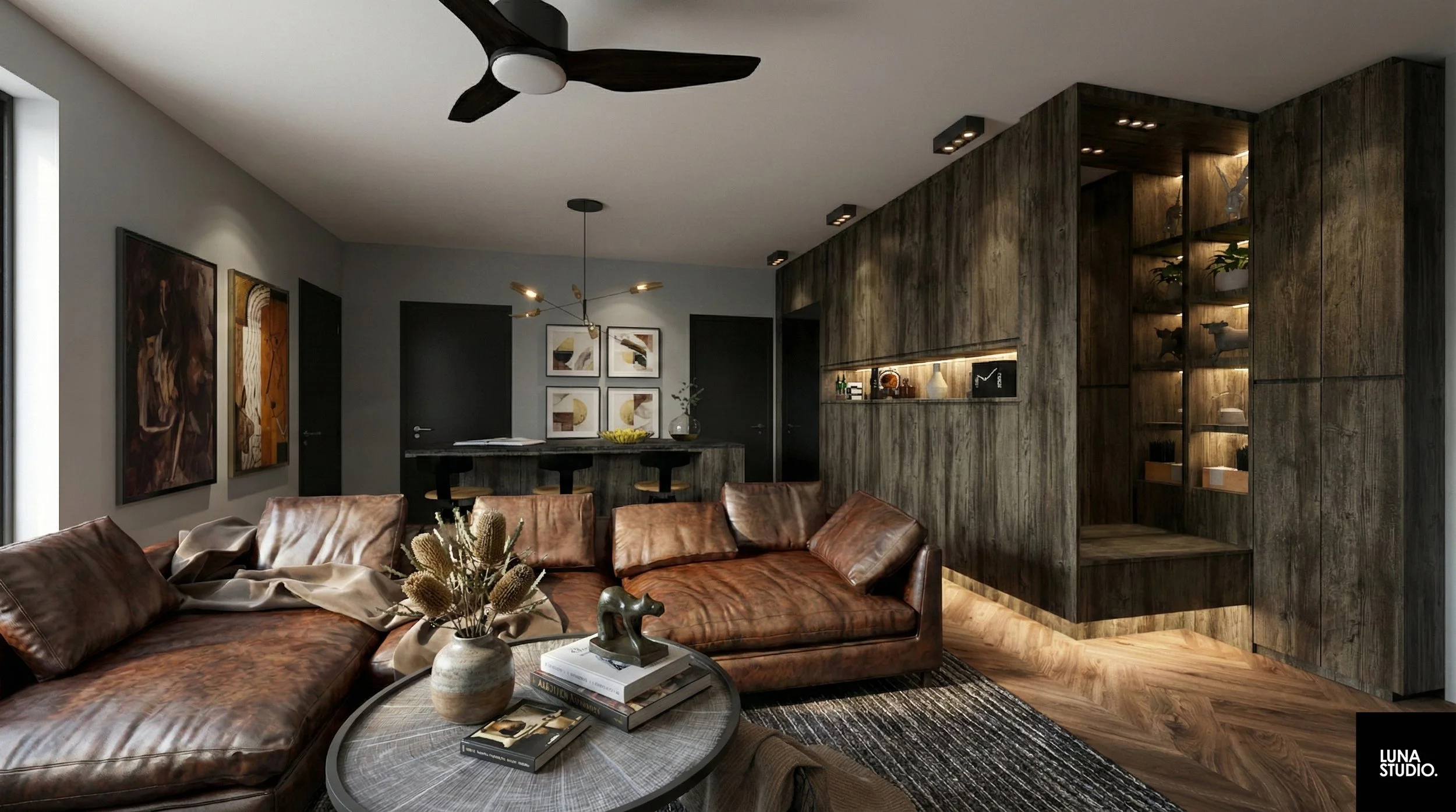 Theme: Masculine Comfort A study in textural layering, this living area creates a cocooning effect. The design language speaks to "lived-in luxury," utilizing aged leather and rich timber to evoke the feeling of a contemporary private club.