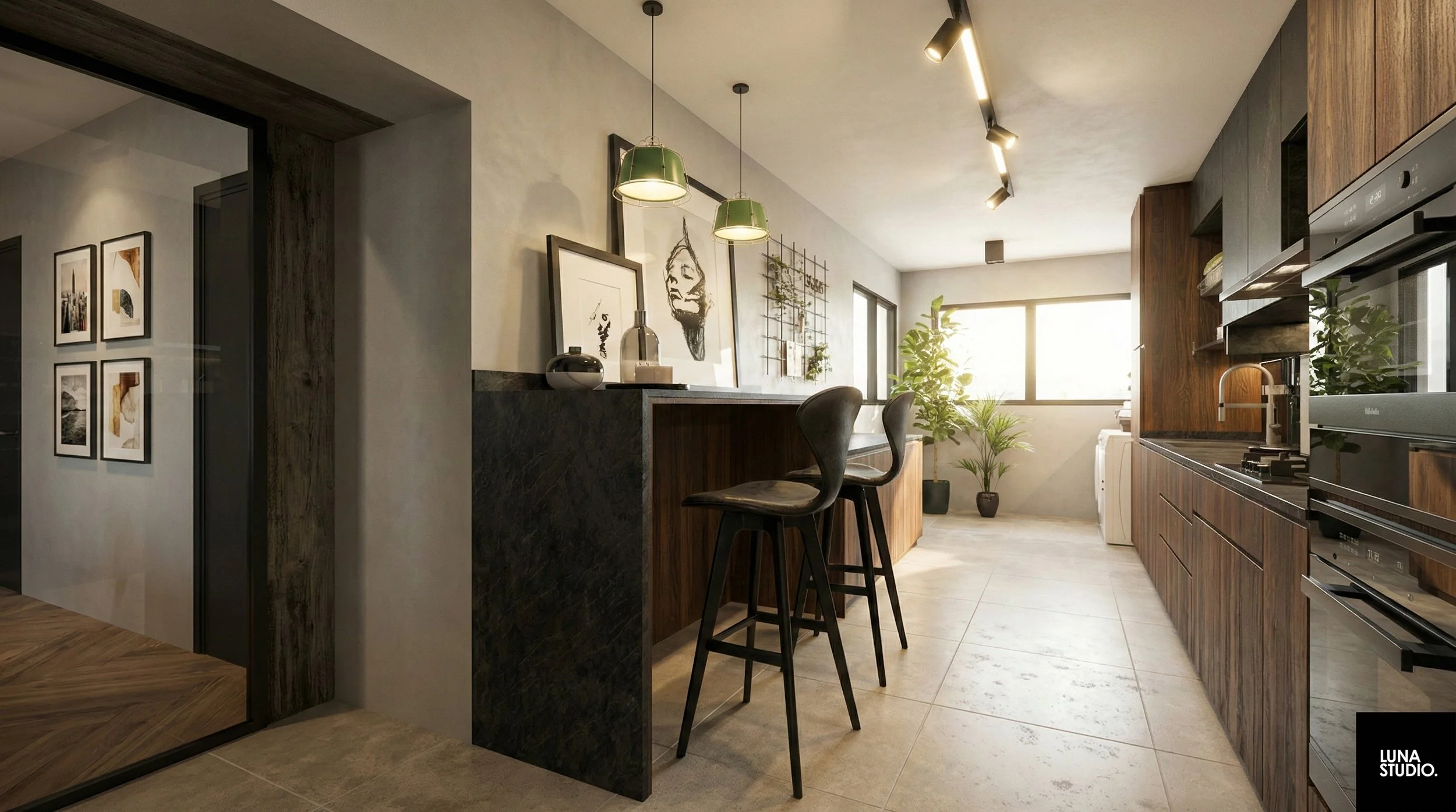Design Solution: A slim, high-top breakfast bar was installed against the wall, utilizing vertical space rather than floor width. Industrial pendant lighting defines the "dining zone" separate from the walkway. The material continuity—dark wood and stone—visually links this narrow space to the main living areas, making it feel expansive rather than constricted.